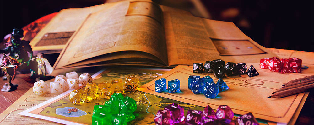 Uma mesa com diversos dados de RPG.